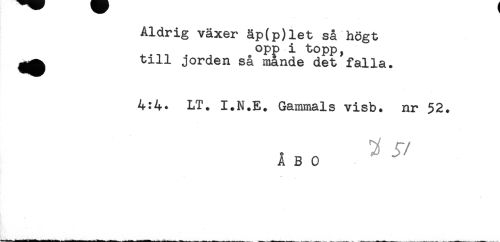 //// Aldrig växer äp(p)let så högt //// opp i topp, //// ^^ till jorden så mande det falla. //// 4:4. LT. I.N.E. Gammals visb. nr 52. //// ABC ^ ////