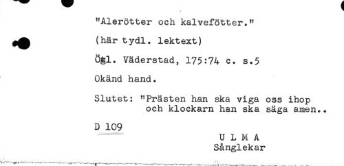 //// "Alerötter och kalvefötter." //// ^^ (här tydl. lektext) //// Ögl. Väderstad, 175:74 c. s.5 //// Okänd hand. //// Slutet: "Prästen han ska viga oss ihop //// och klockarn han ska säga amen.. //// D 109 //// ^ U L M A //// Sånglekar ////