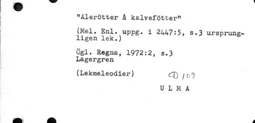 //// "Alerötter å kalvefötter" //// (Mel. Enl. uppg. i 2447:5, s.3 ursprung- //// ligen lek.) //// Ögl. Regna, 1972:2, s.3 //// Lagergren //// (Lekmeleodier) //// U L M A ////