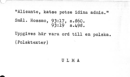//// "Alicante, katse potse idina adnia." //// Smal. Hossmo, 93:17, s.360. //// 93:19 s.493. //// Uppgives här vara ord till en polska. //// (Polsktexter) //// U L M A ////
