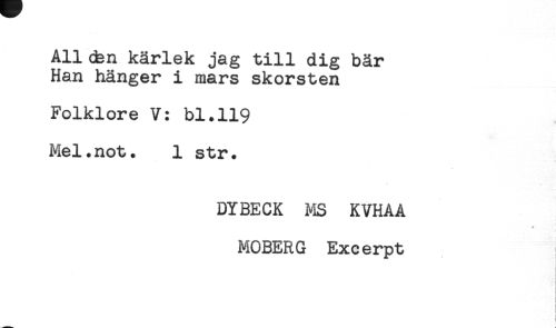 //// All dan kärlek jag till dig bär //// Han hänger i mars skorsten //// Folklore V: bl.119 //// Mel.not. 1 str. //// DYBECK MS KVHAA //// * //// MOBERG Excerpt //// I //// t //// ! ////