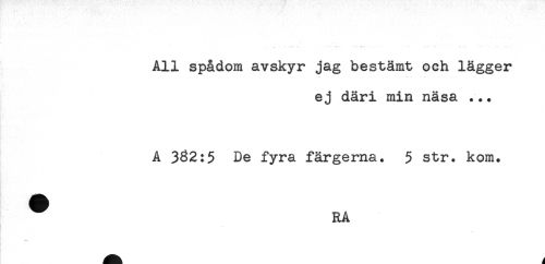 //// All spådom avskyr jag bestämt och lägger //// ej däri min näsa ... //// A 3^2:5 De fyra färgerna. 5 str. kom. //// ^ RA ////