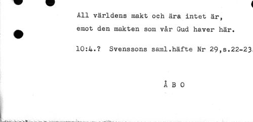 //// All världens makt och ära intet är, //// ^ emot den makten som vår Gud haver här. //// 10:4-? Svenssons saml.häfte Nr 29,s.22-23, //// ÅBO ////