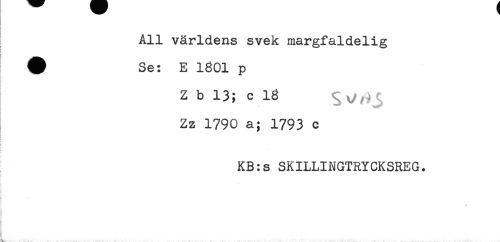 //// All världens svek margfaldelig //// t //// t //// # Se: E 1601 p //// Z b 13; c 16 //// Zz 1790 a; 1793 c //// t //// KB:s SKILLINGTRYCKSREG. //// 5 //// s //// t ////