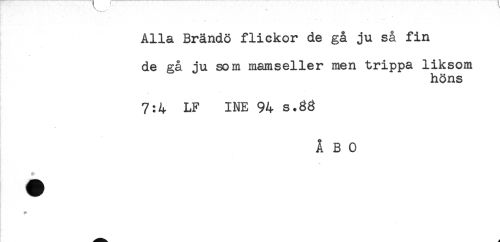 //// Alla Brandö flickor de gå ju så fin //// de gå ju som mamseller men trippa liksom //// höns //// 7:4 LF INE 94 s.3å //// . //// ÅBO //// i * ' //// k ^ ////