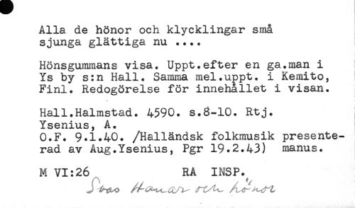 //// Alla de hönor och klycklingar små //// sjunga glättiga nu .... //// < //// Hönsgummans visa. Uppt.efter en ga.man i //// Ys by s:n Hall. Samma mel.uppt. i Kemito, ! //// Finl. Redogörelse för innehållet i visan. //// * //// * //// Hall.Halmstad. 4590. s.3-10. Rtj. //// Ysenius, A. //// O.F. 9.1.40. /Halländsk folkmusik presente- //// rad av Aug.Ysenius, Pgr 19.2.43) manus. //// M VI:26 RA INSP. ////