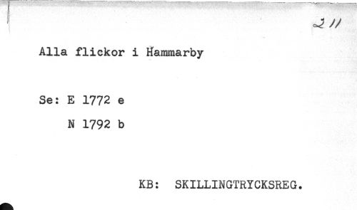 //// Alla flickor i Hammarby //// Se: E 1772 e //// N 1792 b //// KB: SKILLINGTRYCKSREG. ////