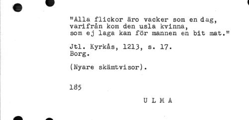 //// "Alla flickor äro vacker som en dag, //// varifrån kom den usla kvinna, //// som ej laga kan för mannen en bit mat." //// - //// Jtl. Kyrkas, 1213, s. 17. //// Borg. //// (Nyare skämtvisor). //// 185 //// U L M A ////