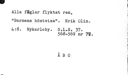 //// Alla fåglar flyktat ren, //// "Barnens höstvisa". Erik Olin. //// H //// 4:8. Nykarleby. S.L.S. 37. //// 568-569 nr 7?. = //// i //// ! //// E //// r //// a //// ÅBO //// - //// 3 //// L. //// a //// E //// ! ////