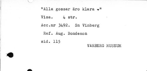//// "Alla gossar äro klara <*" //// Visa. 4 str. //// < //// Acc.nr 3492. Sn Vinberg //// I Ref. Aug. Bondeson //// sid. 115 //// VARBERG MUSEUM //// ! ////