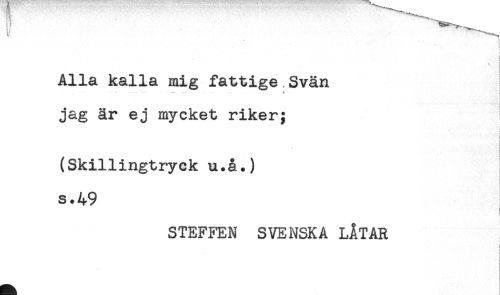 //// * y //// ! //// Alla kalla mig fattige Svän //// -----.. . A //// jag är ej mycket riker; //// ! //// (Skillingtryck u.å.) //// s.49 //// I //// STEFFEN SVENSKA LÅTAR //// ) //// i //// t //// i ////