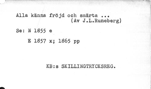 //// Alla känna fröjd och smärta ... //// (Av J.L.Runeberg) //// Se: N 1855 e //// ! //// E 1857 x; 1865 pp //// t //// i //// KB:s SKILLINGTRYCKSREG. //// t //// ( //// 'j //// t //// < //// ! //// ! //// t ////