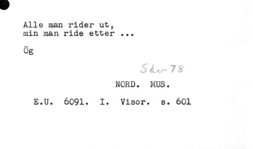 //// Alle man rider ut, //// min man ride etter ... //// Ög //// NORD. MUS. //// E.U. 6091. 1. Visor. s. 601 ////