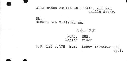 //// Alla manna skulle u6 i fält, min man //// skulle ätter. //// Sk. //// Genarp och V.Alstad snr //// r.......^ //// NORD. MUS. //// Kopior visor //// E.U. 149 s.373 M.m. Lekar leksaker och //// spel. ////