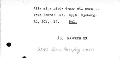 //// Alla mina glada dagar uti sorg... //// Text saknas MA. Uppt. Sjöberg. //// R6, 201,- 17. Mel. //// j //// 1 //// ! //// ÅBO RANCKEN MS //// ! //// i ////