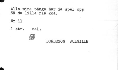 //// Alla mina panga har ja spel opp //// Så da lilla ria koa. //// Nr 11 //// ) //// f //// c //// - //// 1 str. mel. //// % //// BONDESON JULGILLE //// i //// < //// L. //// ! //// r //// ' ////