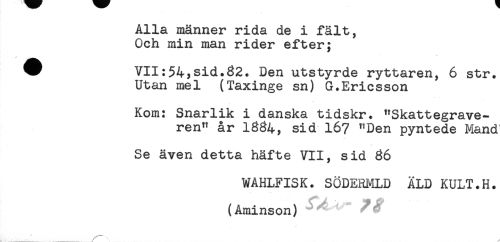 //// Alla männer rida de i fält, //// Och min man rider efter; //// * //// W VII:54,sid.82. Den utstyrde ryttaren, 6 str. //// Utan mel (Taxinge sn) G.Ericsson //// Kom: Snarlik i danska tidskr. "Skattegrave- //// ren" år 1384, sid 167 "Den pyntede Mand //// Se även detta häfte VII, sid 86 //// WAHLFISK. SODERMLD ÄLD KULT.H. //// (Aminson) //// _ ////