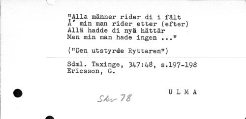 //// Mlla männer rider di i fält //// A* min man rider etter (efter) //// Allä hadde di nyä hättär //// Men min man hade ingen ..." //// ("Den utstyrde Ryttaren") //// Sdml. Taxinge, 347:43, s.197-198 //// Ericsson, G. //// i //// < //// ! //// ^ U L M A ////