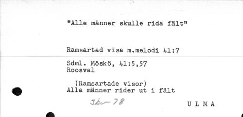 //// "Alle männer skulle rida fält" //// Ramsartad visa m.melodi 41:7 //// . //// Sdml. Möskö, 41:5,57 //// Roosval //// (Ramsartade visor) //// ^ Alla männer rider ut i fält //// ULMA ////