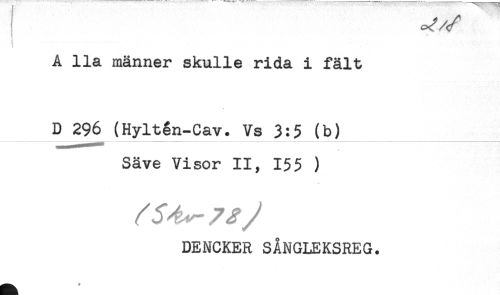 //// i - .... //// A Ila männer skulle rida i fält //// _D 296 (Hylt§n-Cav^Vs^3:5 (b) //// Säve Visor II, 155 ) //// DENCKER SÅNGLEKSREG. ////