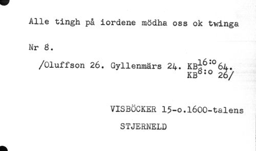 //// Alle tingh på iordene mödha oss ok twinga //// Nr 8. //// /Oluffson 26. Gyllenmärs 24. KB^'°64. //// KB^-o 26 //// /VISBÖCKER 15-o.l600-talens //// STJERNELD ////