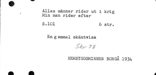 //// Allas männer rider ut i krig //// Min man rider efter //// S.101 6 str. //// En g ammal skämtvisa //// HEMBYGDSMINNEN BORGÅ 1934 ////