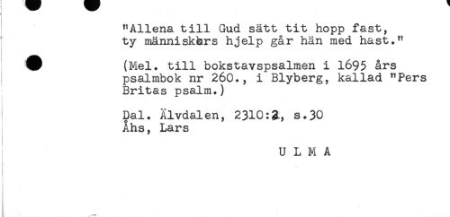 //// "Allena till Gud sätt tit hopp fast, //// ty människors hjelp går hän med hast." //// W (Mel. till bokstavspsalmen i 1695 års //// psalmbok nr 260., i Blyberg, kallad "Pers //// Britas psalm.) //// * //// Dal. Älvdalen, 2310:3-, s.30 //// Åhs, Lars //// ULMA ////