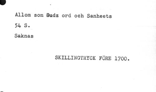 //// Allom som Budz ord och Sanheets //// 54 S. //// Saknas //// SKILLINGTRYCK FÖRE 1700. ////