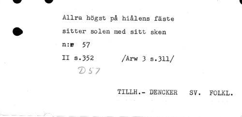 //// Allra högst på hiålens fäste //// ^ sitter solen med sitt sken //// n:B 57 //// II s.352 /Arw 3 s.31l //// /T) 6 7 //// TILLH.- DENCKER SV. FOLKL. ////