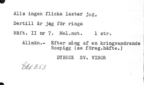 //// Alls ingen flicka lastar jag, //// Dertill är jQg för ringa //// - //// Häft. II nr 7. Mel.not. 1 str. //// Allmän.- Efter sång af en kringvandrande //// Rospigg (se föreg.häfte.) //// DYBECK SV. VISOR //// * r //// C //// ^ ! ////
