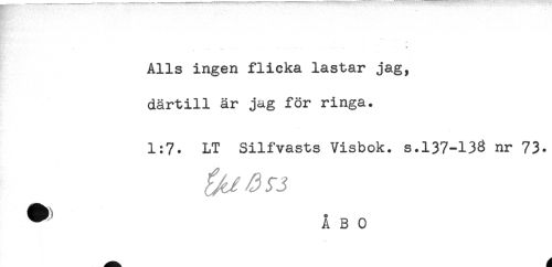 //// . . ...... . . _ . — ' ^ //// Alls ingen flicka lastar jag, //// därtill är jag för ringa. //// 1:7. LT Silfvasts Visbok, s.137-138 nr 73. ////
