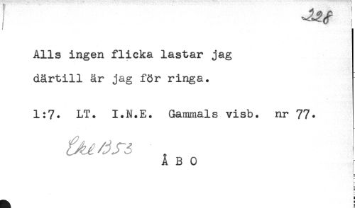 //// Alls ingen flicka lastar jag //// därtill är jag för ringa. //// 1:7. LT. I.N.E. Gammals visb. nr 77. //// ÅBO ; //// — //// r //// H ////