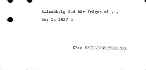 //// Allsmäktig Gud hår frågas må ... //// ^ Se: Zz 1327 d //// KB:s SKILLINGTRYCKSREG. //// - *' //// i //// L..... ....... ////