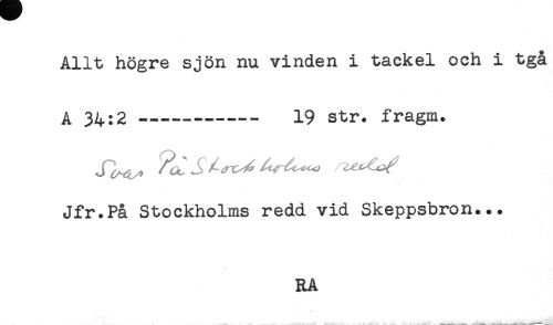 //// Allt högre sjön nu vinden i tackel och i tgå //// A 34:2--- 19 str. fragm. //// J i /t ^ ^^^ ^ ^ ^ //// Jfr.På Stockholms redd vid Skeppsbron... //// RA ////