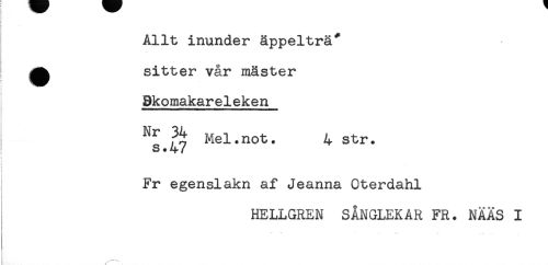 //// Allt inunder äppelträ* //// ^ sitter vår mäster //// 8komakareleken //// ^ ^ Mel.not. 4 str. //// s.47 //// ? //// Fr egenslakn af Jeanna Oterdahl //// HELLGREN SÅNGLEKAR FR. NAAS I ////