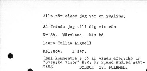 //// Allt när såsom jag var en yngling, //// ! .... i. //// Så fr&ade jag till dig min vän //// Nr 86. Wärmland. Näs hd //// Laura Tullia Lignell //// Mel.not. 1 str. //// ^ (Enl.kommentra s.$5 är visan aftryckt ur //// "Svenska Visor" H.2. Nr 2,med ändrad sätt- //// Ring) DYBECK SV. FOLKMEL. ////