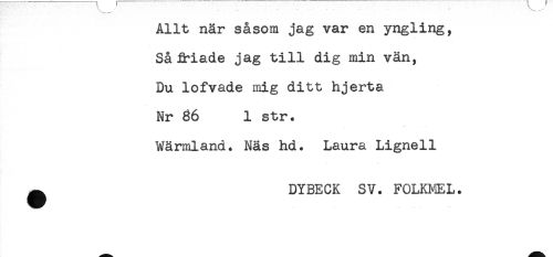 //// Allt når såsom jag var en yngling, //// Så Ålade jag till dig min vän, //// Du lofvade mig ditt hjerta //// Nr 86 1 str. //// Wärmland. Näs hd. Laura Lignell //// ^ DYBECK SV. FOLKMEL. ////