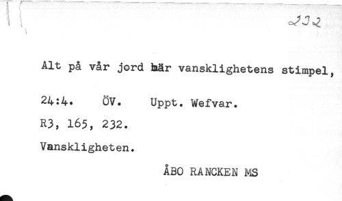 //// S t C^JQ //// Alt på vår jord hår vansklighetens stimpel, //// 24:4. ÖV. Uppt. Wefvar. //// R3, 165, 232. //// Vanskligheten. //// ÅBO RANCKEN MS ////