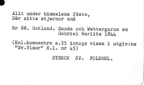 //// Allt under himmelens fäste, //// Där sitta stjernor små ! //// j //// Nr 38. Gotland. Sanda och Wettergarns sn //// Gabriel Herlitz 1344 //// (Enl.kommentra s.55 intogs visan i utgiv:ns //// "Sv.Visor" H.l. nr 45) //// { //// DYBECK SV. FOLKMEL. ////