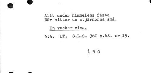 //// Allt under himmelens fäste //// Där sitter de stjärnorna små. //// En vacker visa. //// 5:4. LT. S.L.S. 360 s.68. nr 15. //// ÅBO ////
