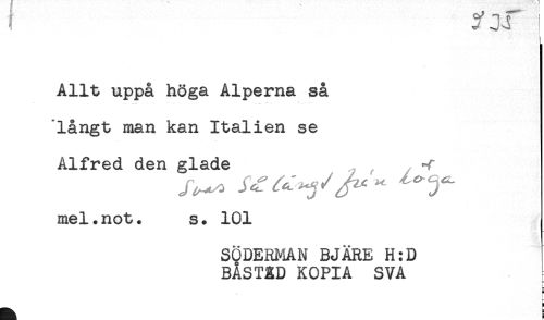 //// Allt uppå höga Alperna så //// långt man kan Italien se //// Alfred den glade //// mel.not. s. 101 //// SÖDERMAN BJÄRE H:D //// BASTXD KOPIA SVA //// <- ////