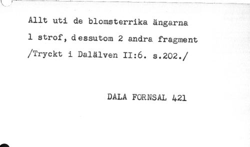//// Allt uti de blomsterrika ängarna //// 1 strof, dessutom 2 andra fragment //// /Tryckt i Dalälven 11:6. s.202. //// /DALA FORNSAL 421 ////