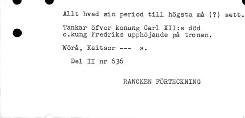 //// Allt hvad sin period till högsta må (?) sett. //// ^ Tankar öfver konung Carl XII:s död //// ^ o.kung Fredriks upphöjande på tronen. //// Wörå, Kaitsor --- s. //// Del II nr 636 //// RANCKEN FÖRTECKNING ////