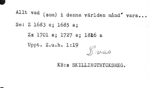 //// Allt vad (gom) i denna världen månd* vara... //// Se: Z 1633 c; 1685 a; //// Zz 1701 a; 1727 a; I33t6 a //// Uppt. Z.u.h. 1:19 //// j //// KB:s SKILLINGTRYCKSREG. ////