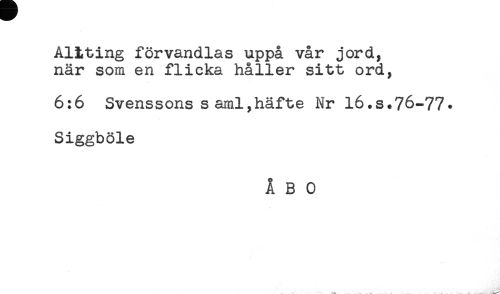 //// Altting förvandlas uppå vår jord, //// när som en flicka håller sitt ord, //// 6:6 Svenssons saml,häfte Nr 16.S+76-77. //// Siggböle //// ÅBO //// " ' St ^ . . . . , . <'-. .... ^ ////