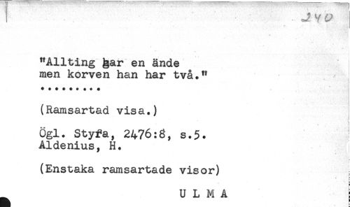 //// ! - . - 39B,- ? ^ //// "Allting ^ar en ände //// men korven han har två." //// (Ramsartad visa.) //// t //// t //// Ögl. Styfa, 2476:6, s.5. //// Aldenius, H. //// i //// (Enstaka ramsartade visor) [ //// * //// ULMA ////