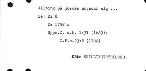 //// Allting pa jorden skyndar sig ... //// * //// Se: Za 8 //// Zz 1758 a //// Upps.Z. u.h. 1:31 (1683); //// Z.P.s.23:8 (1702) //// KB^s SKILLINGTRYCKSREG. //// . - ////