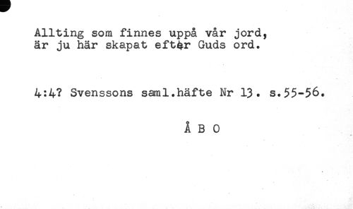 //// Allting som finnes uppå vår jord, //// är ju här skapat eft^r Guds ord. //// 4-- //// 4:4? Svenssons saml.häfte Nr 13. s.55-56. //// ÅBO //// "/A*. ,, . -*'- - ////