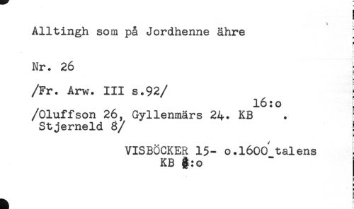 //// Alltingh som på Jordhenne ähre ; //// H //// Nr. 26 //// /Fr. Arw. III s.92 //// /l6:o [ //// /Oluffson 26, Gyllenmärs 24. KB . ! //// Stjerneld 8/ ! //// VISBÖCKER 15- o.1600'talens //// KB g:o //// a //// B ////