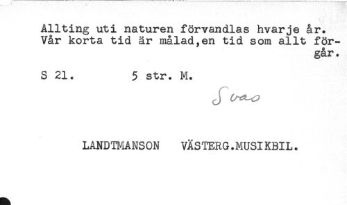 //// Allting uti naturen förvandlas hvarje år. //// Vår korta tid är målad,en tid som allt för- //// går. //// S 21. 5 str. M. //// J //// LANDTMANSON VÄSTERG.MUSIKBIL. ////